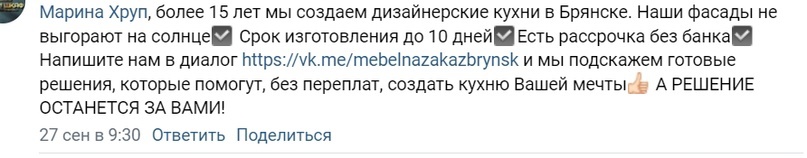 Продвижение во Вконтакте на изготовление кухонь на заказ в Рыбной Слободе